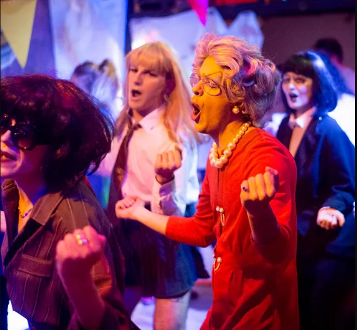 Comme au cabaret, des artistes interviennent le temps d’un numéro, le temps d’une musique, sans prévenir, partagent leur monde intérieur, ludique, poétique, émouvant parfois, dans des formes improbables, sans pour autant se positionner au centre de l’attention (tu es libre de continuer à danser, boire un verre, rêvasser, sortir fumer, etc.), puis continuent à danser parmi tout le monde.